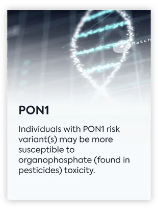 Discover how your PON1 gene can potentially impact organophosphate (found in pesticides) toxicity, imbalance in the lipid levels, cardiovascular issues, and more.